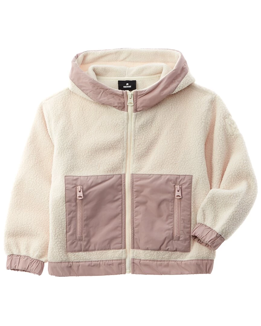- Brady Jacket In Cream With Sherpa Design, Hooded Back, Two Front Zippered Pockets And Elasticized Cuffs And Hem