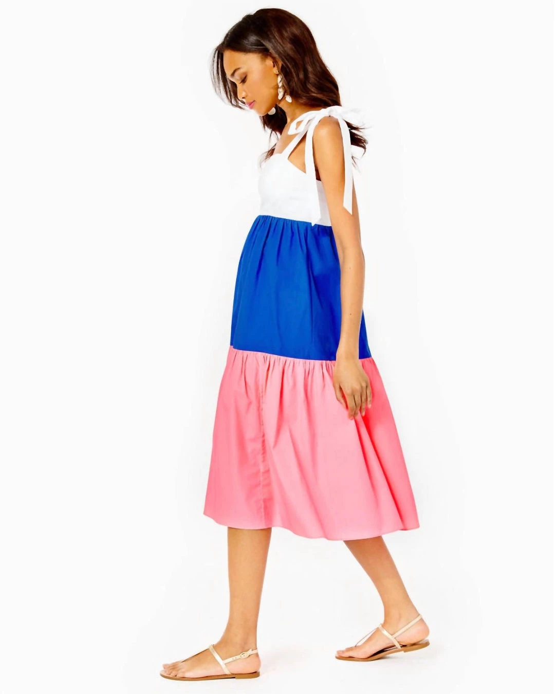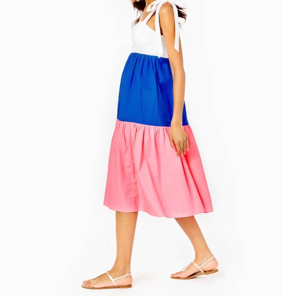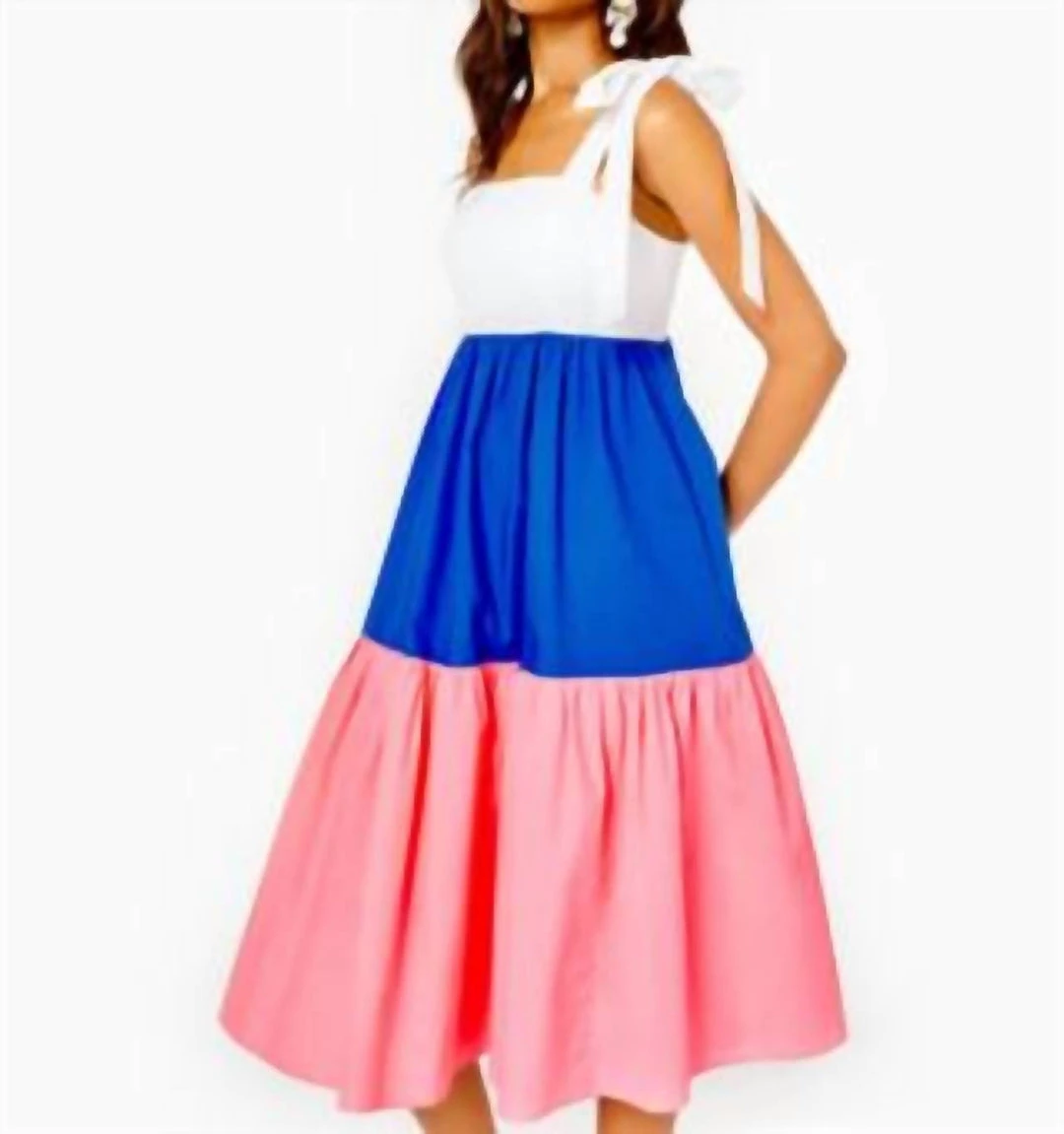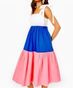 Fit and flare, tiered midi dress with functional tie straps, empire bodice with cups, smocked back panel, and side seam pockets.46″ From top of shoulder to hem (based on a size small/4).Length – Midi.Fits against body at chest and waist and is full at bottom hem.Beachy Cotton LawnMachine wash cold, delicate cycle, separately.Imported.