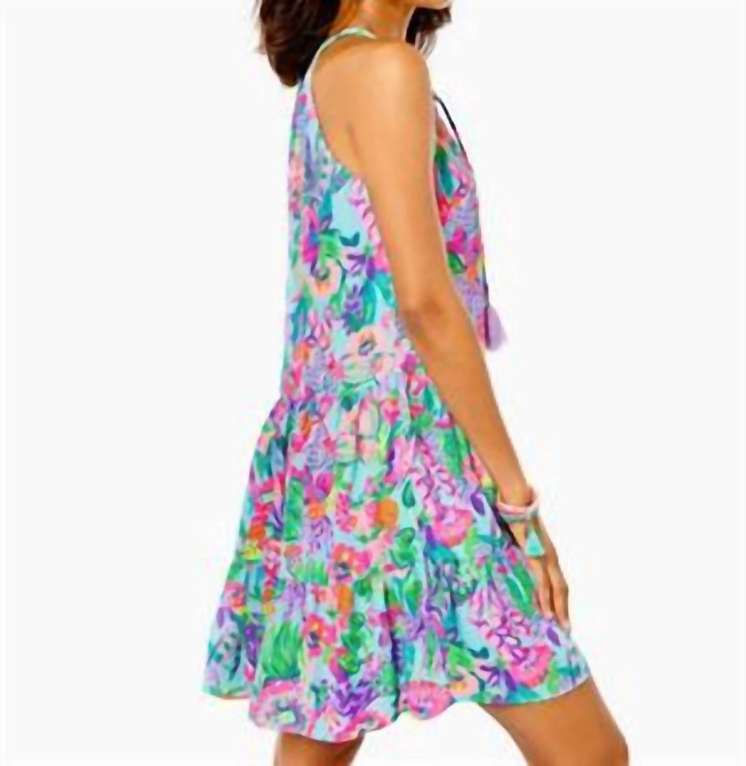 Swing fit, tiered, halter dress with button-front placket and neck ties with pop color tassels.36″ From top of shoulder to hem (based on a size small/4).Length – Above the knee.Falls against the body at the chest and is full at bottom hem.Lileeze – This machine washable, lightweight, airy fabric Machine wash cold, separately.Imported.