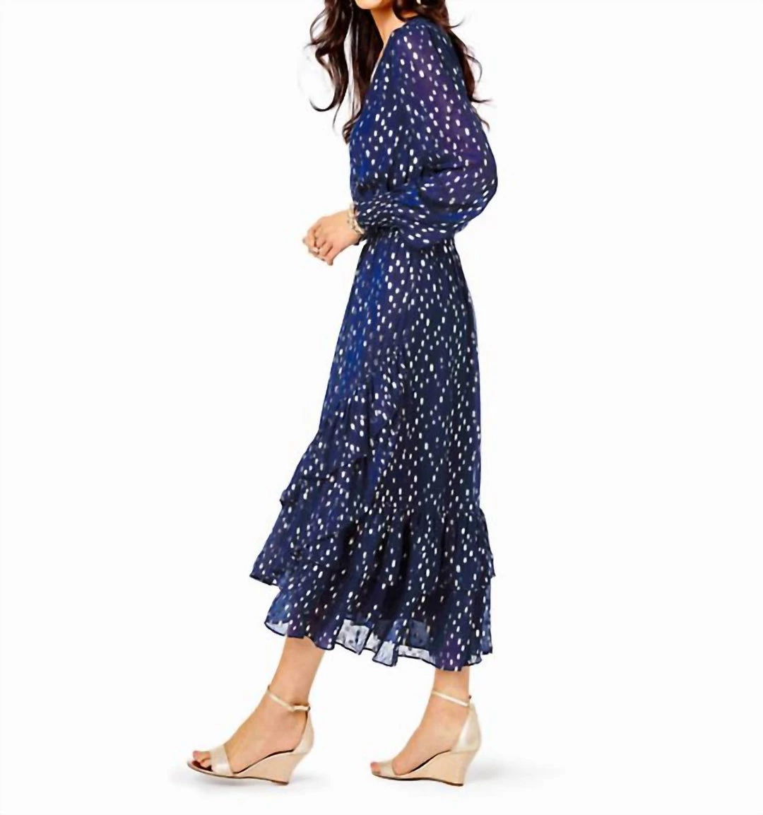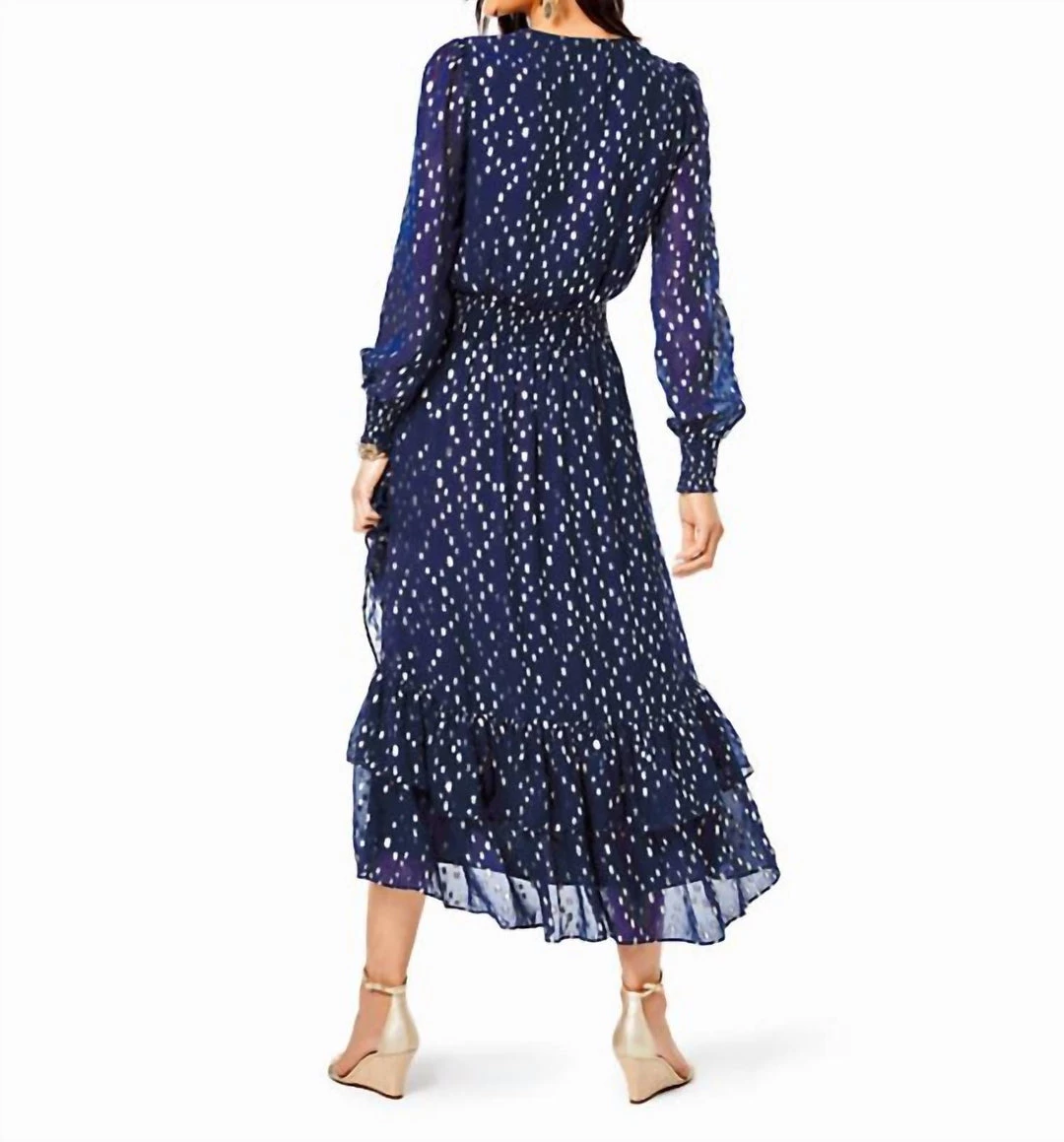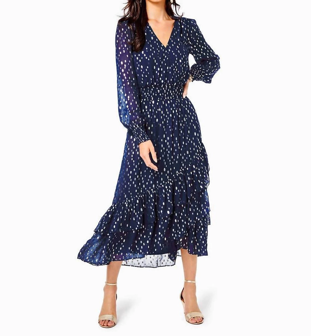 A ruffled skirt makes our Cristiana Midi Dress the season’s most romantic social style. Shimmering with metallic details, this easy fit midi offers a surplice neckline and long sleeves with smocked cuffs.Easy fit midi dress with surplice neckline, long sleeves with smocked cuffs, and ruffles at skirt hem.46″ from top of shoulder to hem (based on a size small/4).Length – Midi.Slightly loose from chest through bottom.Viscose Metallic Clip DobbyDry clean.Imported.