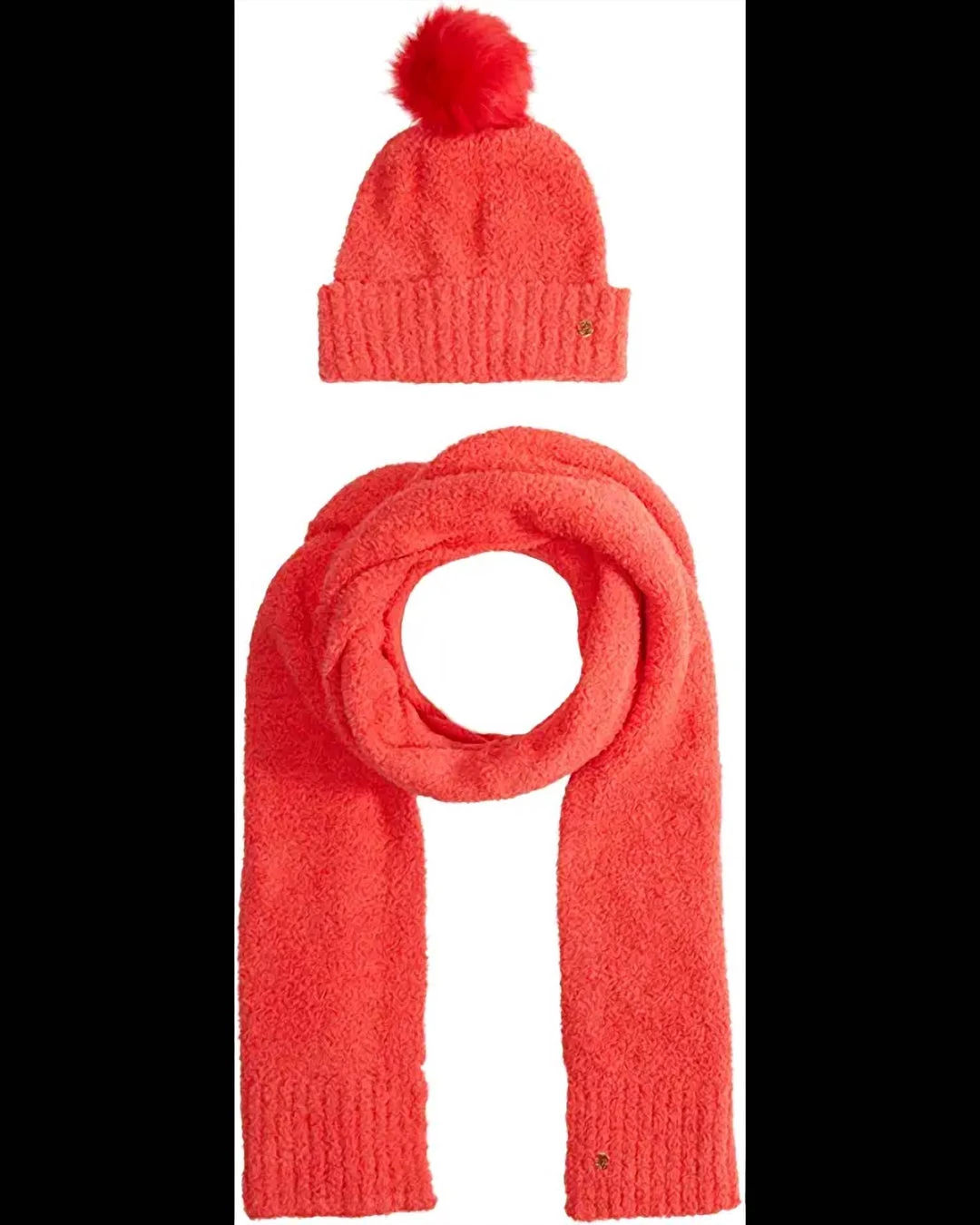 Hat and scarf set containing chenille hat with ribbed trim and large pom-pom, scarf with ribbed ends.Scarf measures 18″W x 80″L.Soft Chenille Hand wash cold, separately.Imported.
