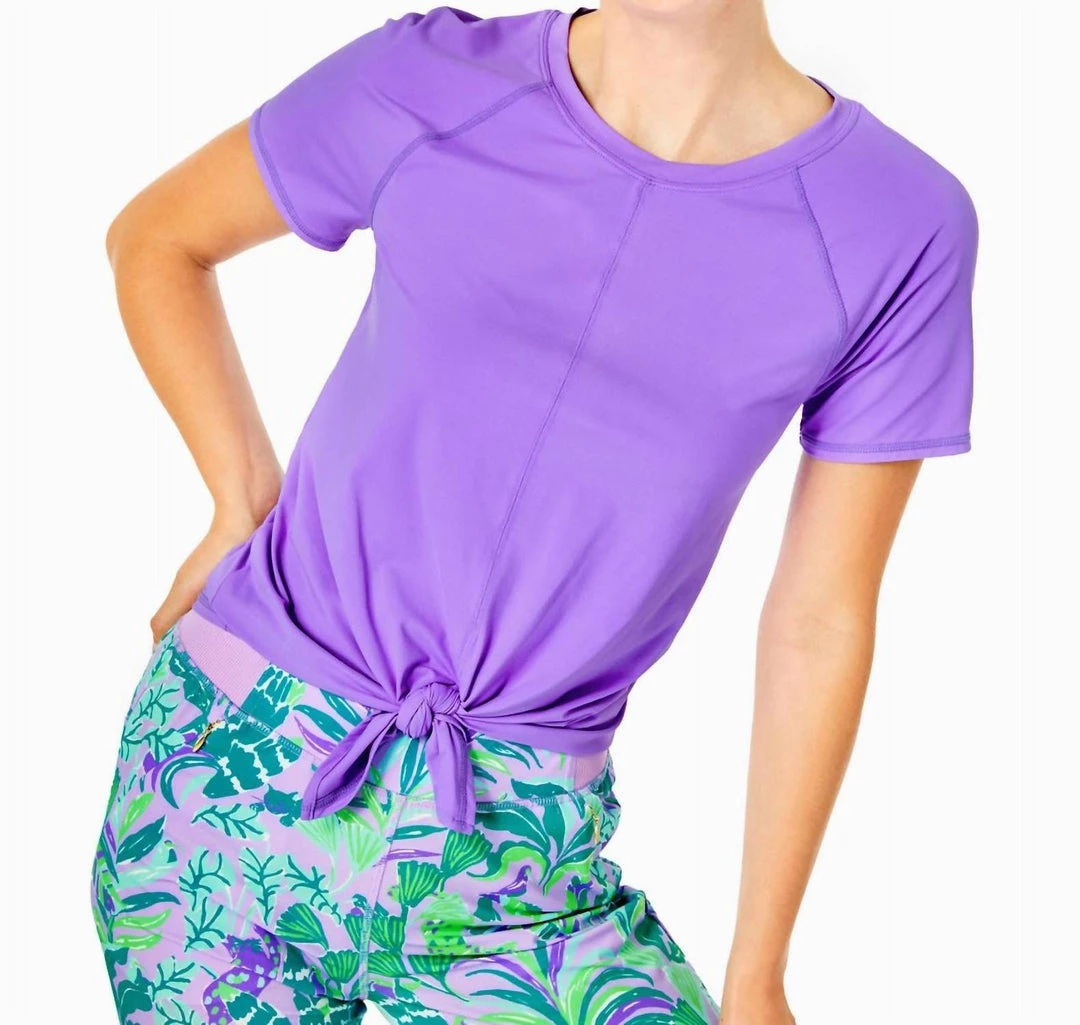 UPF 50+ Luxletic tie front active tee.Fits against body at chest and hip with more room at the waist.Meryl Nylon – Superbly soft meryl yarn provides moisture management and excellent sun protection (UPF 50+ rating).Machine wash cold, delicate cycle, separately.Imported.SKU – Â 006108