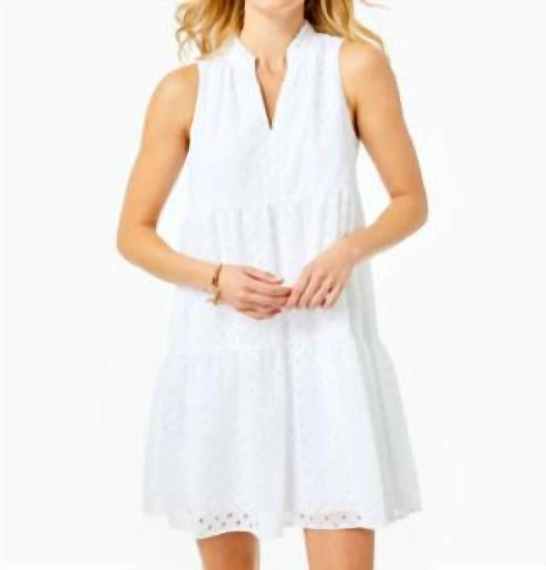 This tiered, swing-fit design includes a notch neckline, ruffle collar, and side seam pockets.Swing fit, tiered dress with notched neckline, ruffled collar detail and side seam pockets.37″ From top of shoulder to hem (based on a size small/4).Length – Above the knee.Falls against the body at the chest and is full at bottom hem.Mini Medallion Chiffon EyeletMachine wash cold, delicate cycle, separately.Imported.SKU – รย 010605