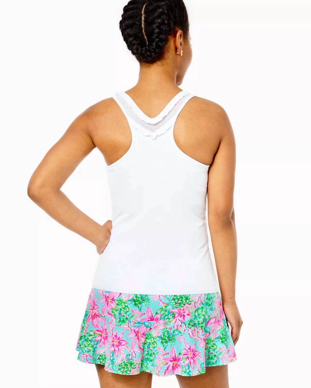 UPF 50+ Luxletic bra tank top with mesh and ruffle insets, built in shelf bra and removable cups.Fits against body at chest, waist and hip with close-to-body line fit.Meryl Nylon – Superbly soft Meryl yarn provides moisture management and excellent sun protection (UPF 50+ rating).Machine wash cold, delicate cycle, separately.Imported.