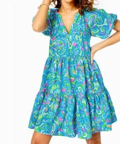 Swing fit, tiered dress with notch neckline, short puff sleeves with elastic cuffs, side seam pockets and smocking detail at tiers36″ From top of shoulder to hem (based on a size small/4).Length – above the knee.Poly Poplin