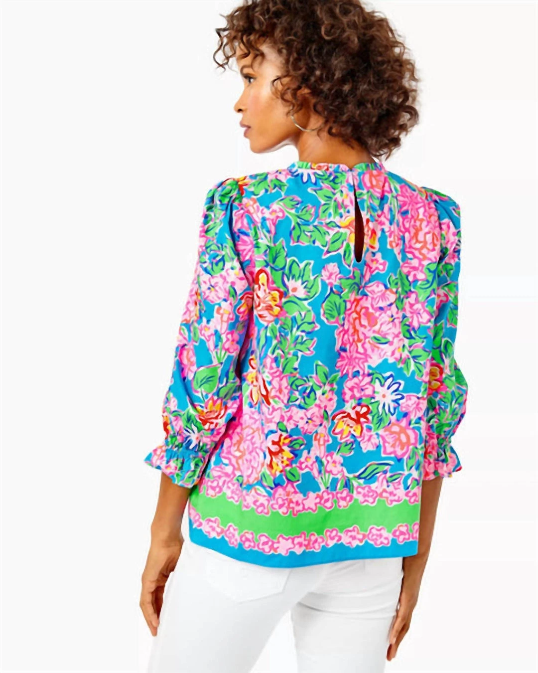 Easy fit top with small ruffle at crew neckline and 3/4-length sleeves with elastic and ruffle hem finish.Skims the body. Roomier fit.Cotton Poplin Machine wash cold, separately.Imported.