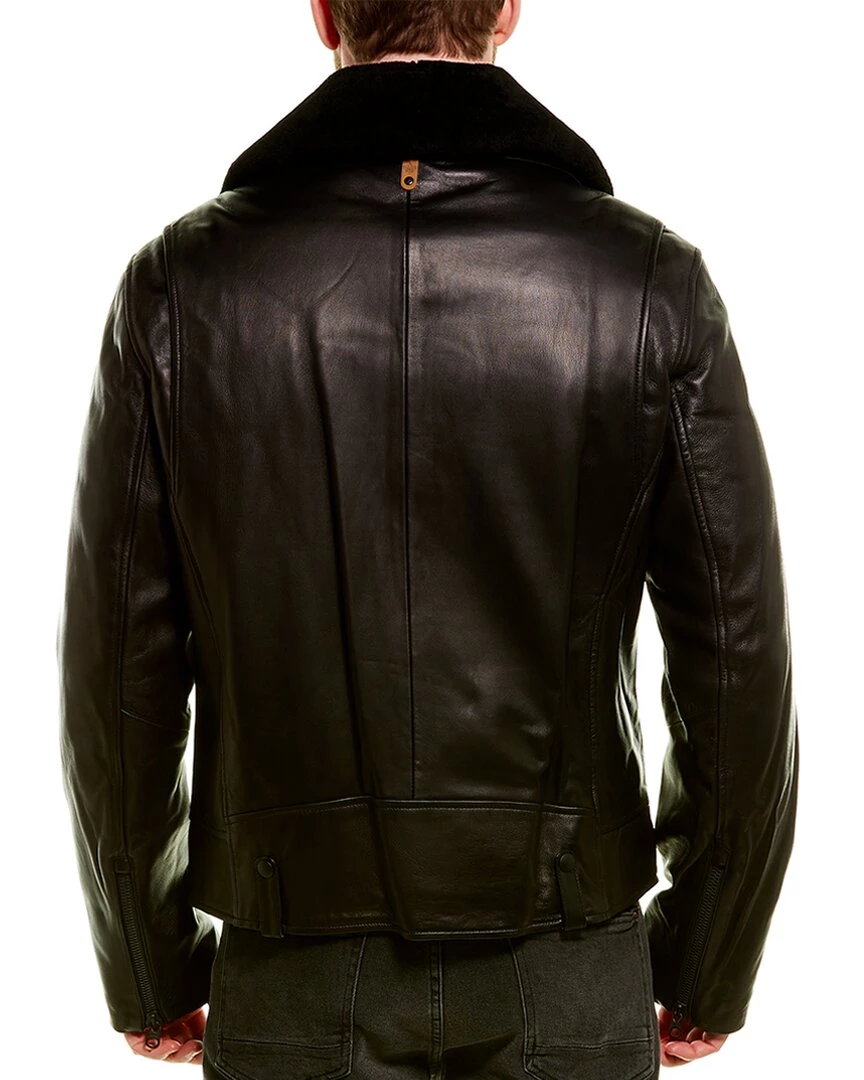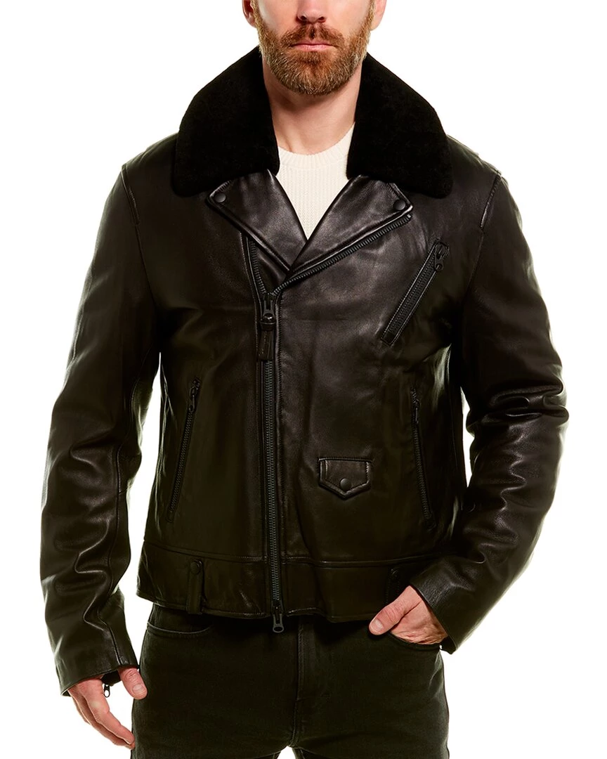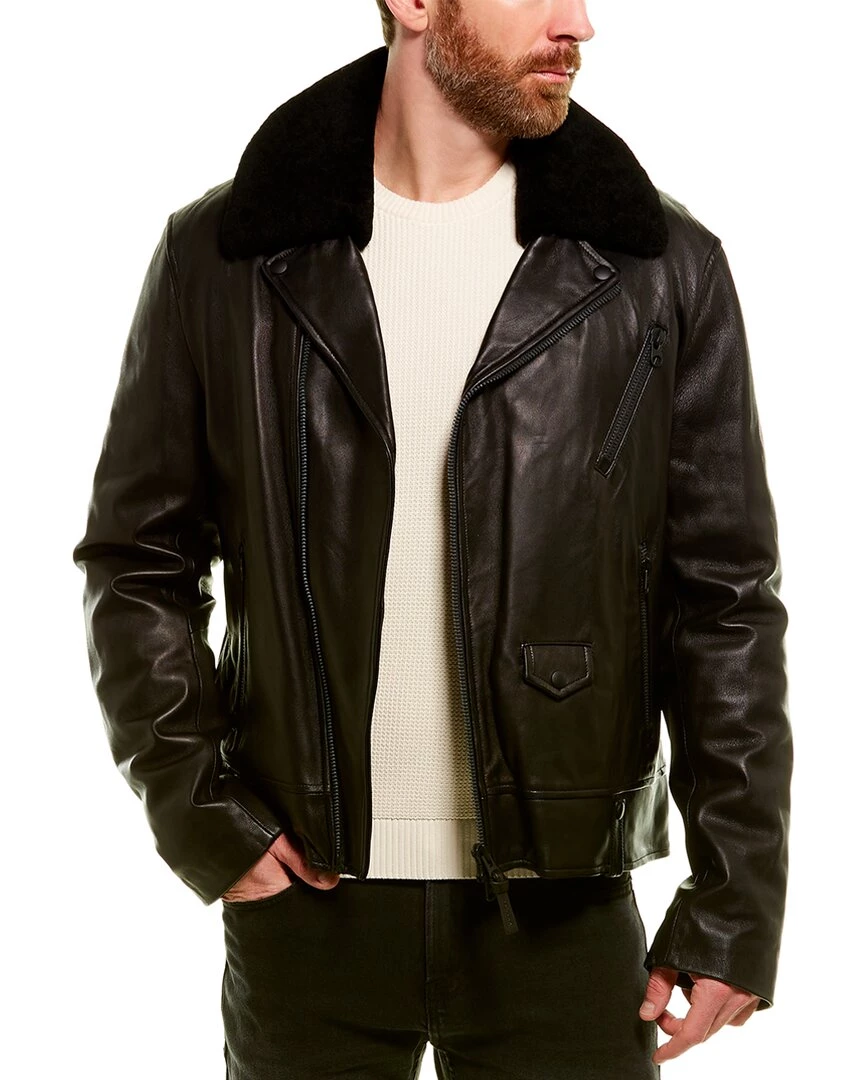 - Roan Motorcycle Leather Jacket In Black With Removable Fur Collar, Zippered Left Chest Pocket, Three Front Pockets, Zippered Cuffs, And Quilted Lining