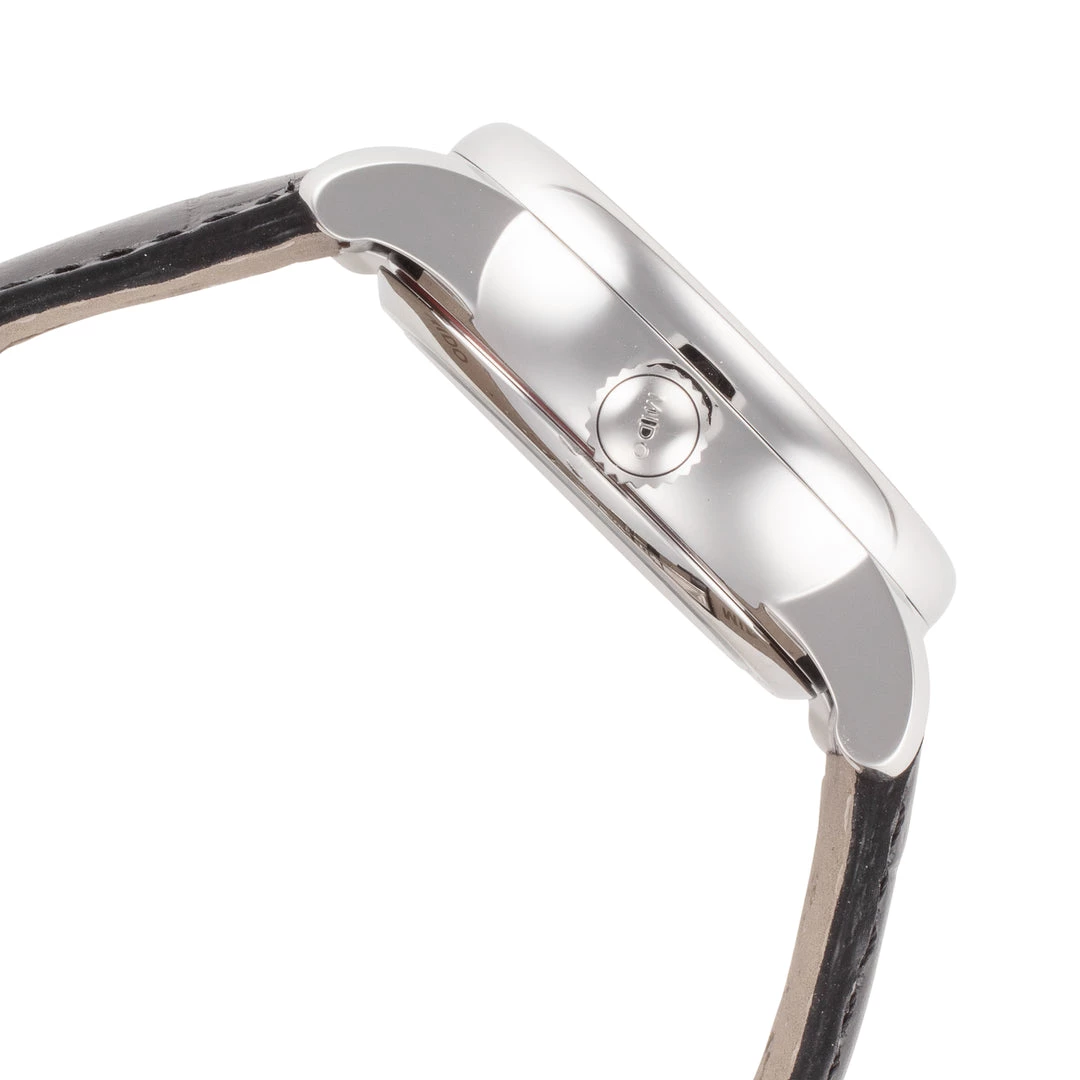 The case is made of durable Stainless Steel. The case width is 35mm and the dial is protected by a Sapphire Crystal Scratch Resistant. It’s water resistant up to 50 m (165 feet). The Strap is Black Leather and the dial is Silver. The movement is Automatic.