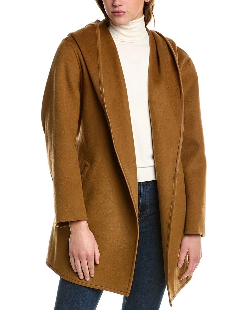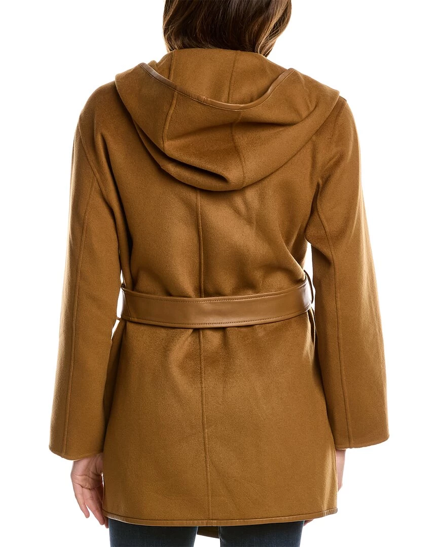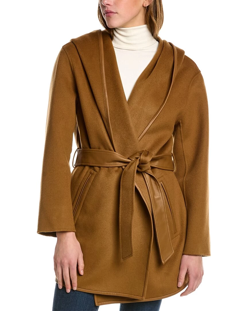 - Amina Leather-Trim Wool Coat In Camel With Shawl Lapel, Hooded Back, Dual Front Pockets And Self-Tie Belt At Waist