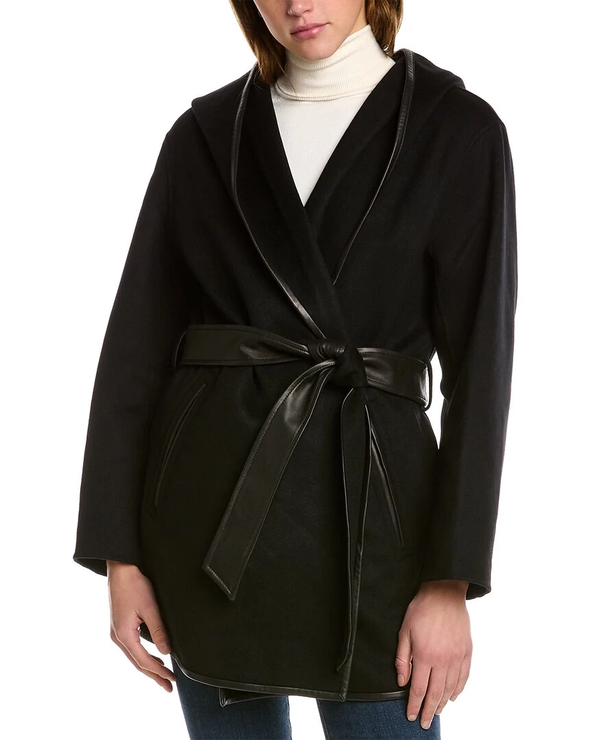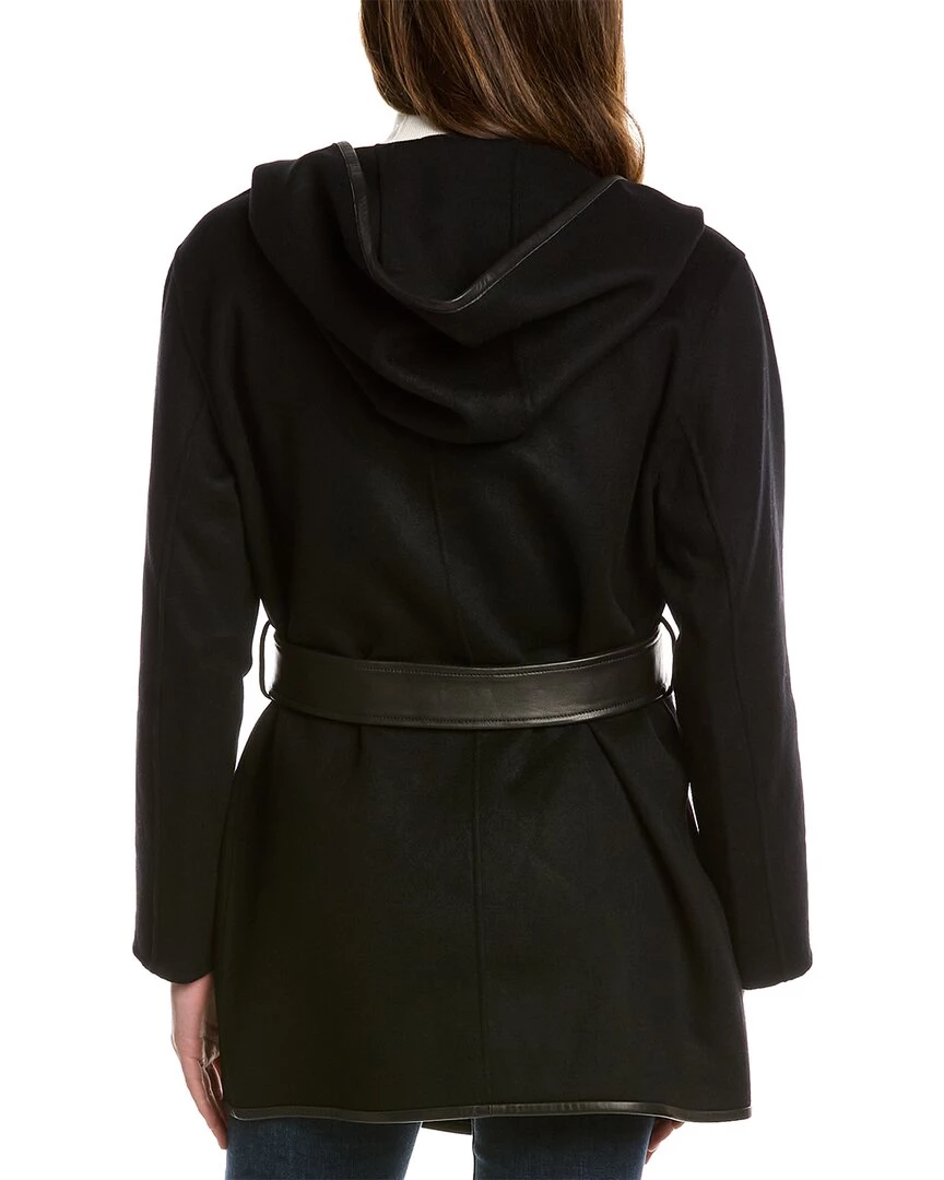 - Amina Leather-Trim Wool Coat In Black With Shawl Lapel, Hooded Back, Dual Front Pockets And Self-Tie Belt At Waist