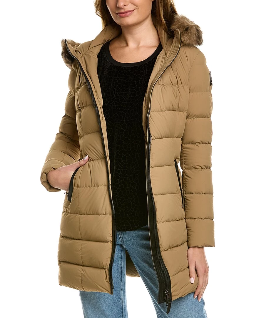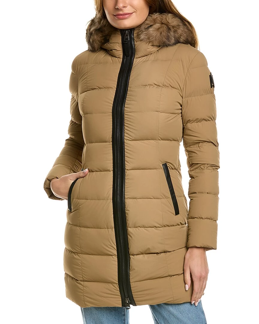 - Calla Leather-Trim Medium Down Coat In Dark Camel With Puffer Style, Stand-Up Collar, Fur-Trim Drawcord Hood, Dual Front Zip Pockets, And Leather Trim