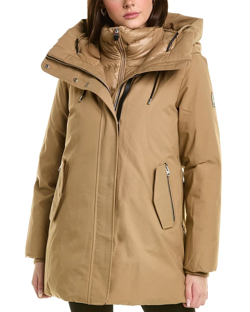 - Kinslee Oversized Down Parka In Camel With Stand-Up Collar, Drawstring Hood, Four Front Pockets, Ribbed Inner Cuffs, Removable Quilted Vest, And Inner Drawcord Waistband