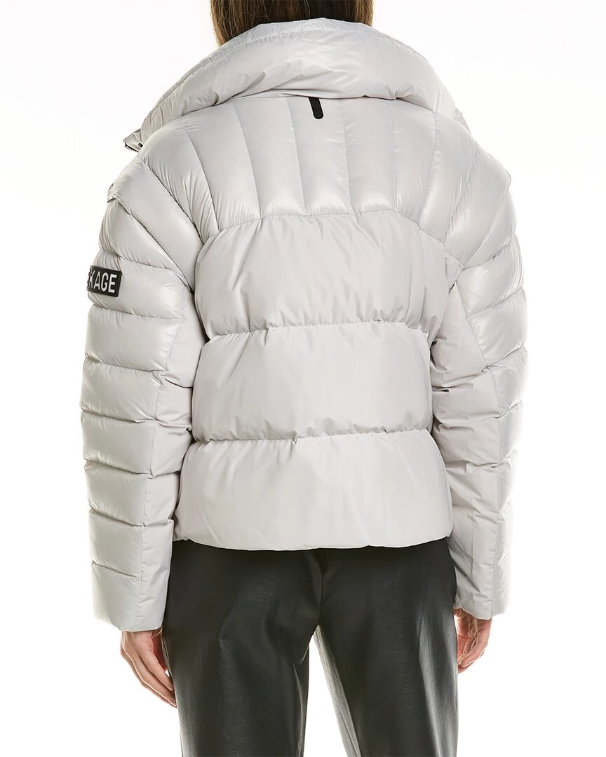 - Vesna Down Jacket In Moon With Funnel Neck, Zip-Off Sleeves, Two Zippered Front Pockets, Inner Cuffs, And Drawcord At Hem