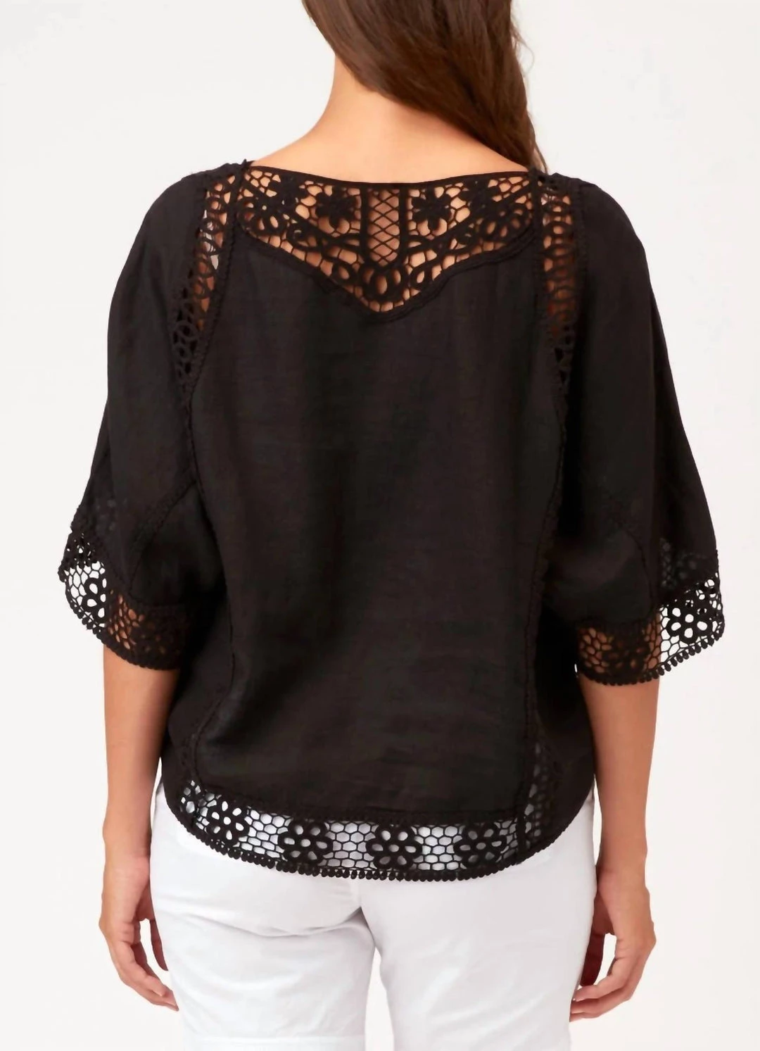 Features a dolman elbow sleeve and a cotton crochet trim throughout.