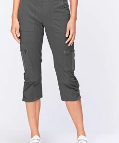 Features a pull on elastic waistband, two front pockets and two cargo zip pockets, clean back and style lines for added comfort.Crop pant styleRelaxed fitElastic waistbandTwo front patch pocketsTwo cargo zip pocketsRuched detailingUpper calf lengthMachine wash cold